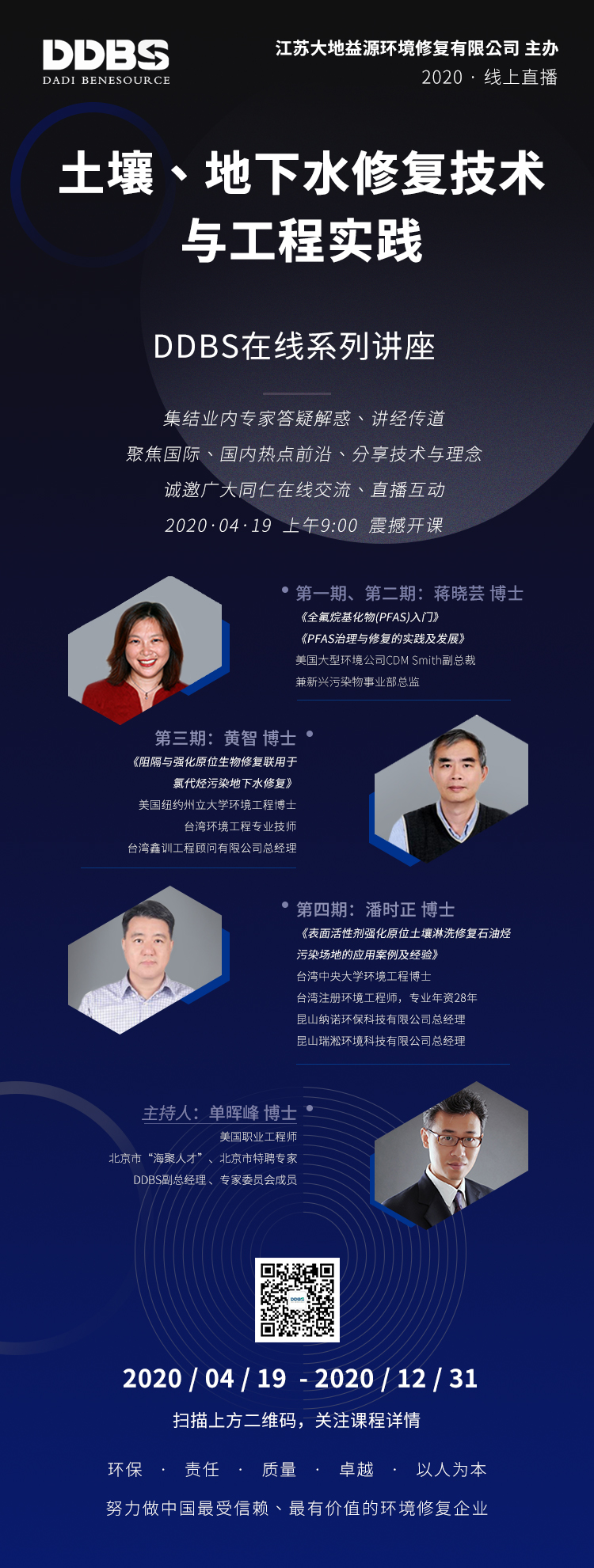 “DDBS在線系列講座”由江蘇大地益源環境修復有限公司專家委員會主持,今年計劃推出四個檔期的講座課程,4月19日上午9點即將迎來首期課程開播!