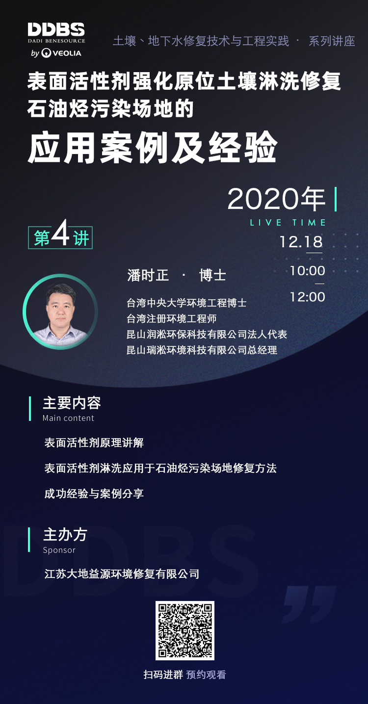 DDBS系列講座第四期,也是本年度的收官一期,由潘時正博士主講題為“表面活性劑強化原位土壤淋洗修復石油烴污染場地的應用案例及經驗”的主題講座。