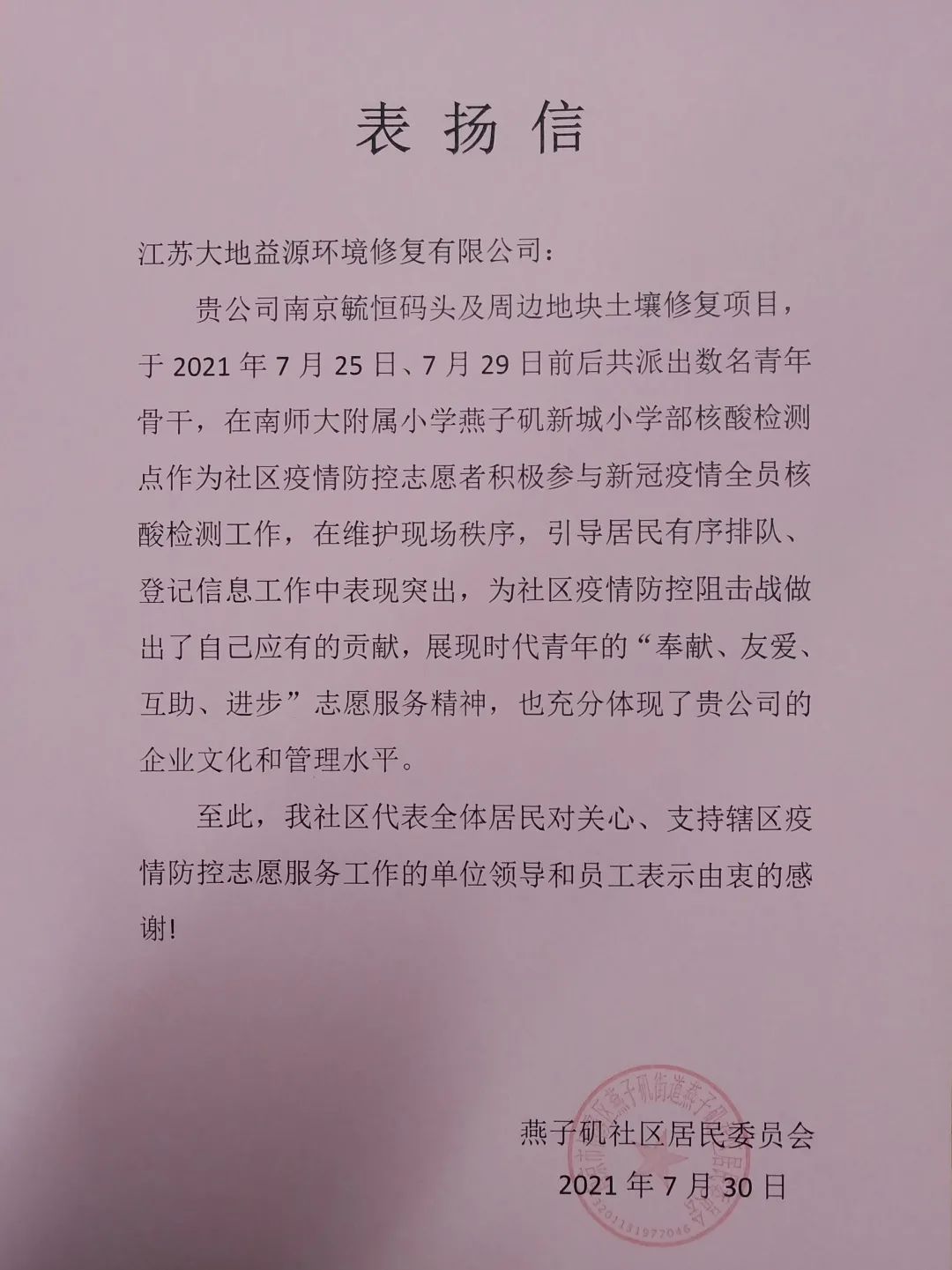 感謝信中這樣寫道:“貴公司南京毓恒碼頭及周邊土壤修復項目部,于2021年7月25日、29日前后共派出數名青年骨干,在南師大附屬小學燕子磯新城小學部核酸檢測點,作為社區疫情防控志愿者積極參與新冠疫情全員核算檢測工作,在維護現場秩序、登記信息等工作中表現突出,為社區疫情防控做出了應有貢獻,展現了時代青年的“奉獻、友愛、互助、進步“志愿服務精神,也充分體現了貴公司的企業文化和管理水平。“