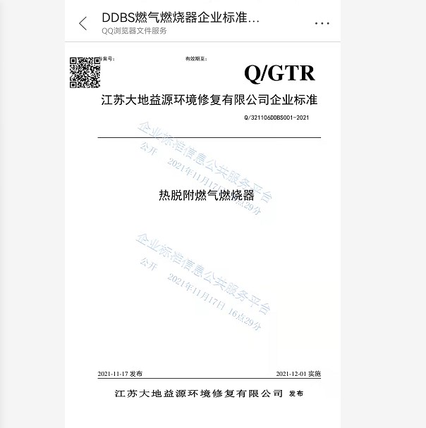 近期,企業(yè)產(chǎn)品標(biāo)準(zhǔn)公共服務(wù)平臺發(fā)布了由大地益源編寫的Q/321106ddbs001-2021《熱脫附燃?xì)馊紵鳌菲髽I(yè)標(biāo)準(zhǔn)。