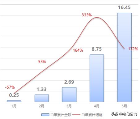 前五月全國土壤修復訂單金額累計達到16.45億元,同比大幅增長172%;單月累計同比增速分別為-57%、53%、164%、333%、172%,表明上半年市場呈現爆發之勢。